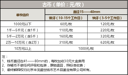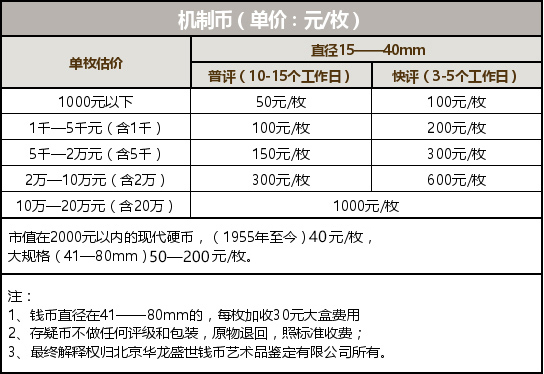 紙幣評級價格與機制幣(15-40毫米)價格一致