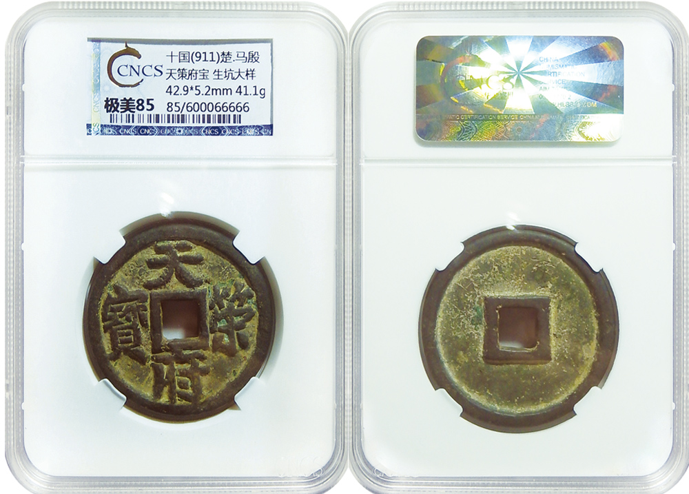 鎏金“天策府寶”是五代十國時期馬殷于梁乾化元年(公元911年)所鑄。馬殷曾受后梁太祖冊封為天策上將軍,建天策府,為紀念此事鑄天策府寶。現存“天策府寶”銅錢流傳極少,鎏金者更是鳳毛麟角,傳世者現藏于上海博物館、中國國家博物館。